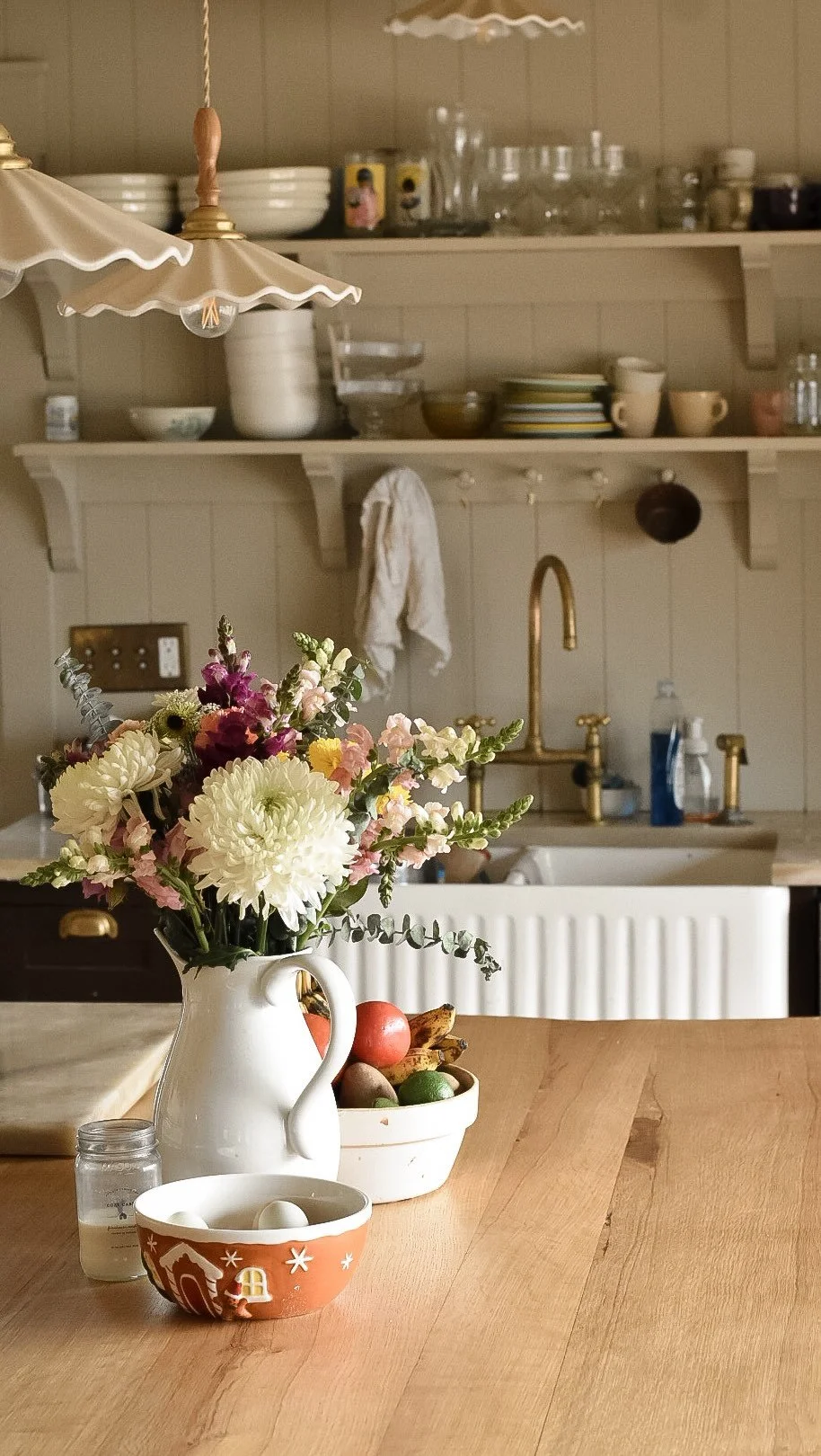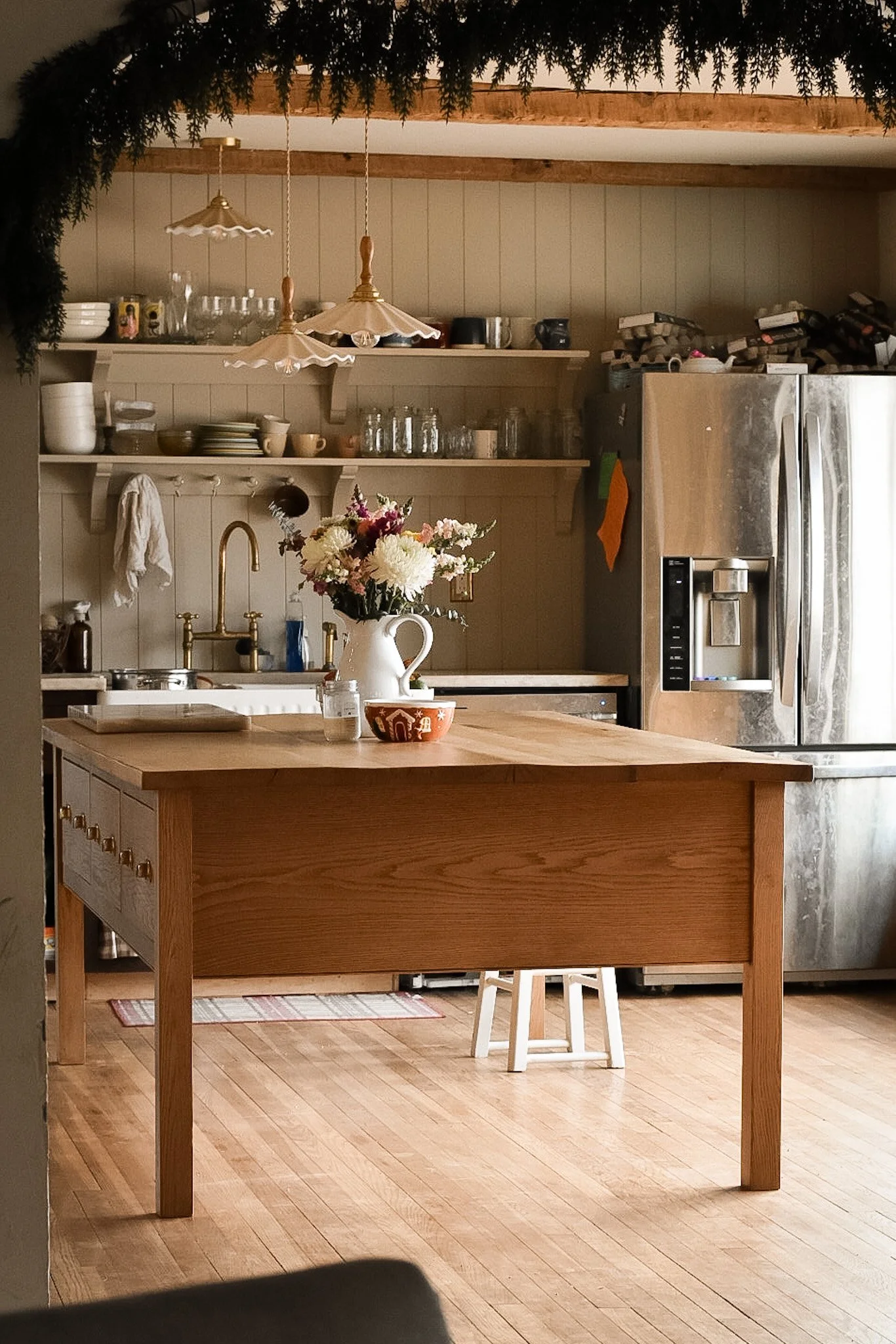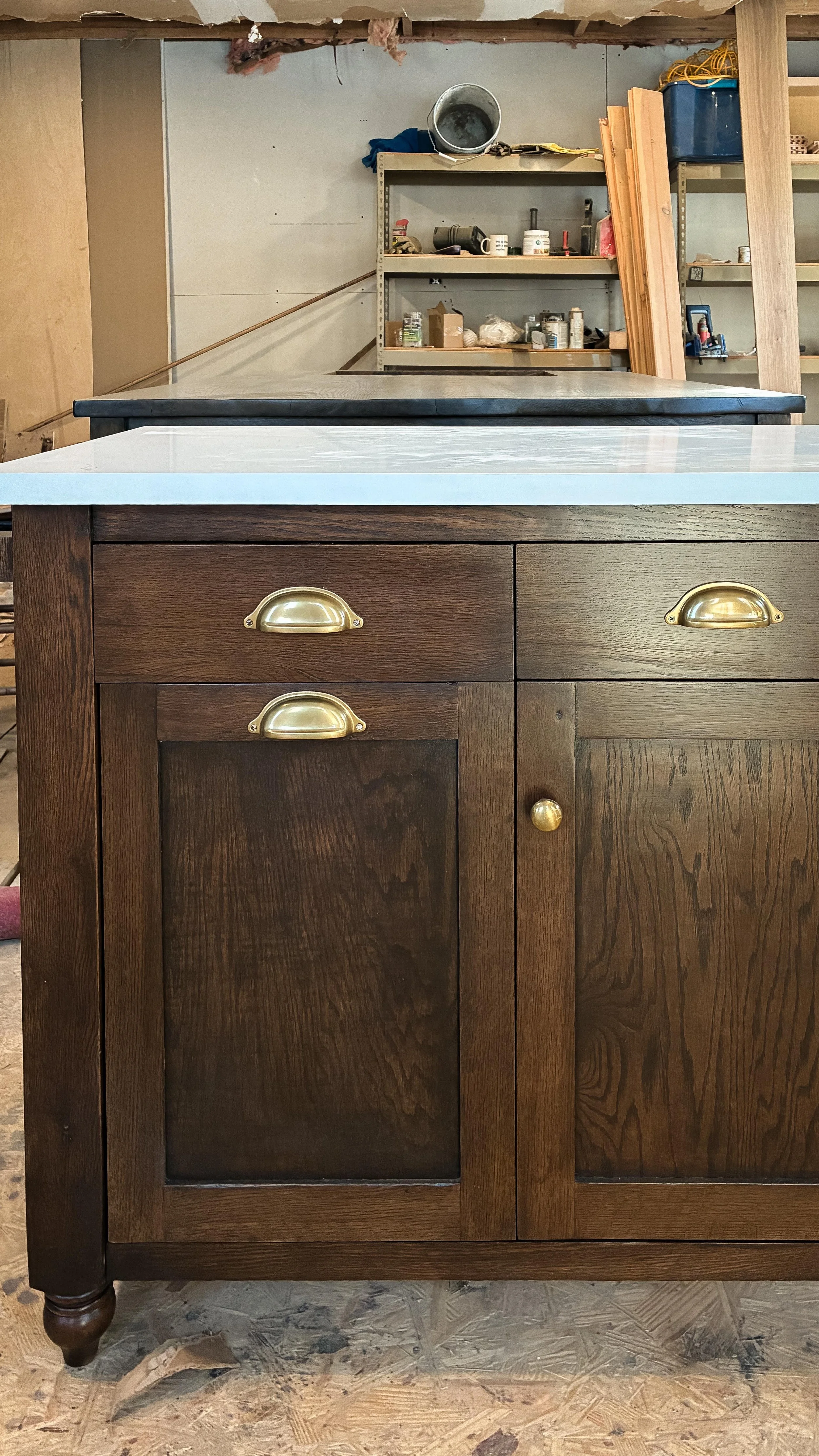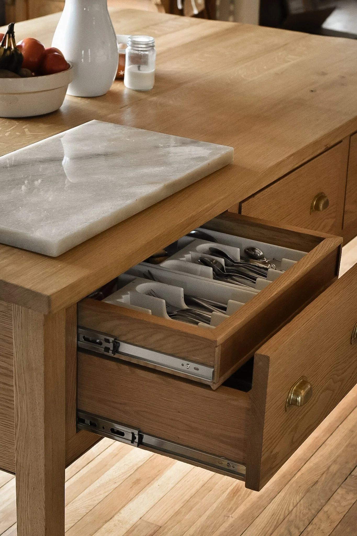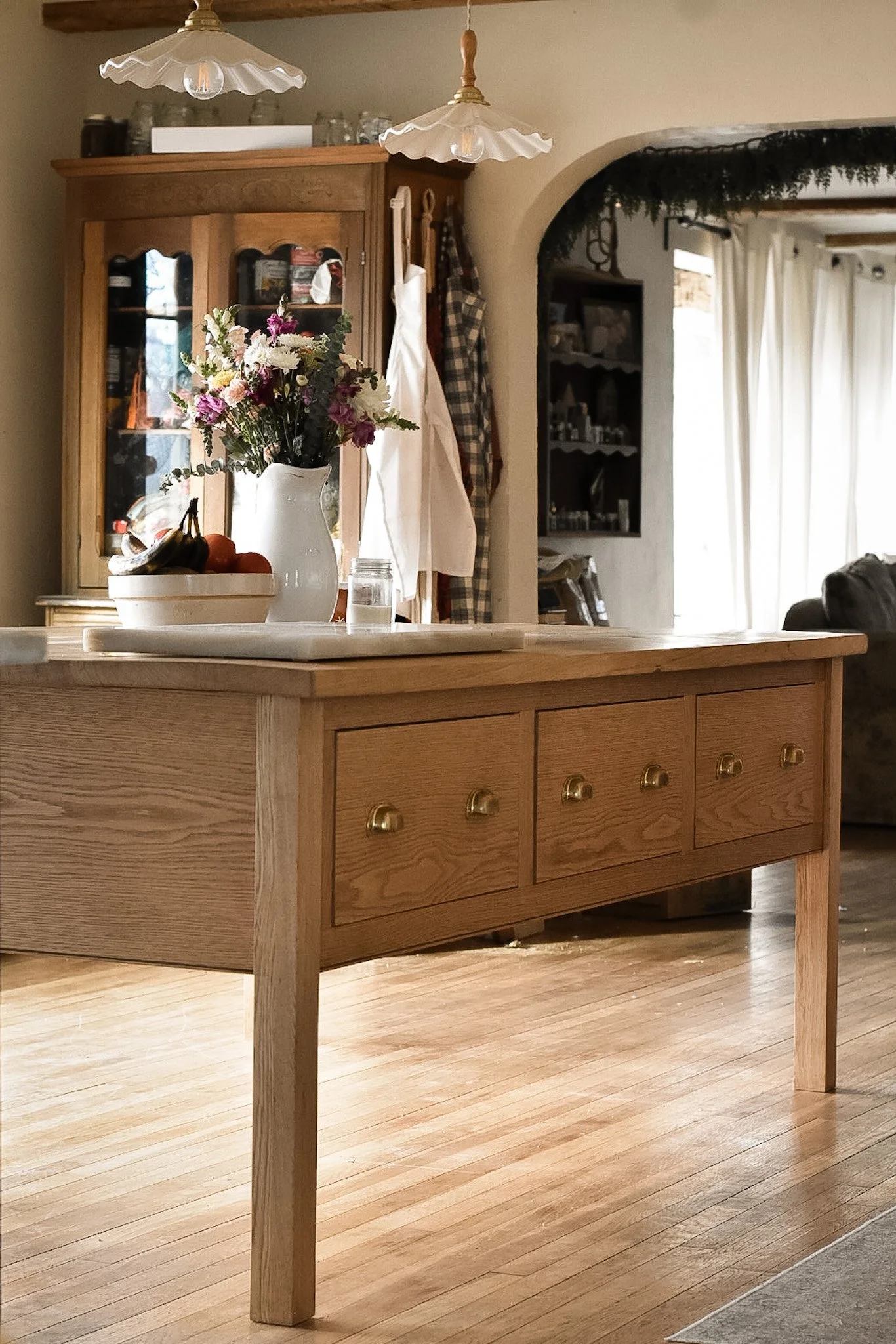 Clean lines, integrated apron drawers, and understated brass hardware give it the feel of a collected heirloom rather than built-in cabinetry. Built for daily use and made to age beautifully, it serves equally well as a prep surface, gathering place, or quiet centerpiece to everyday life.
